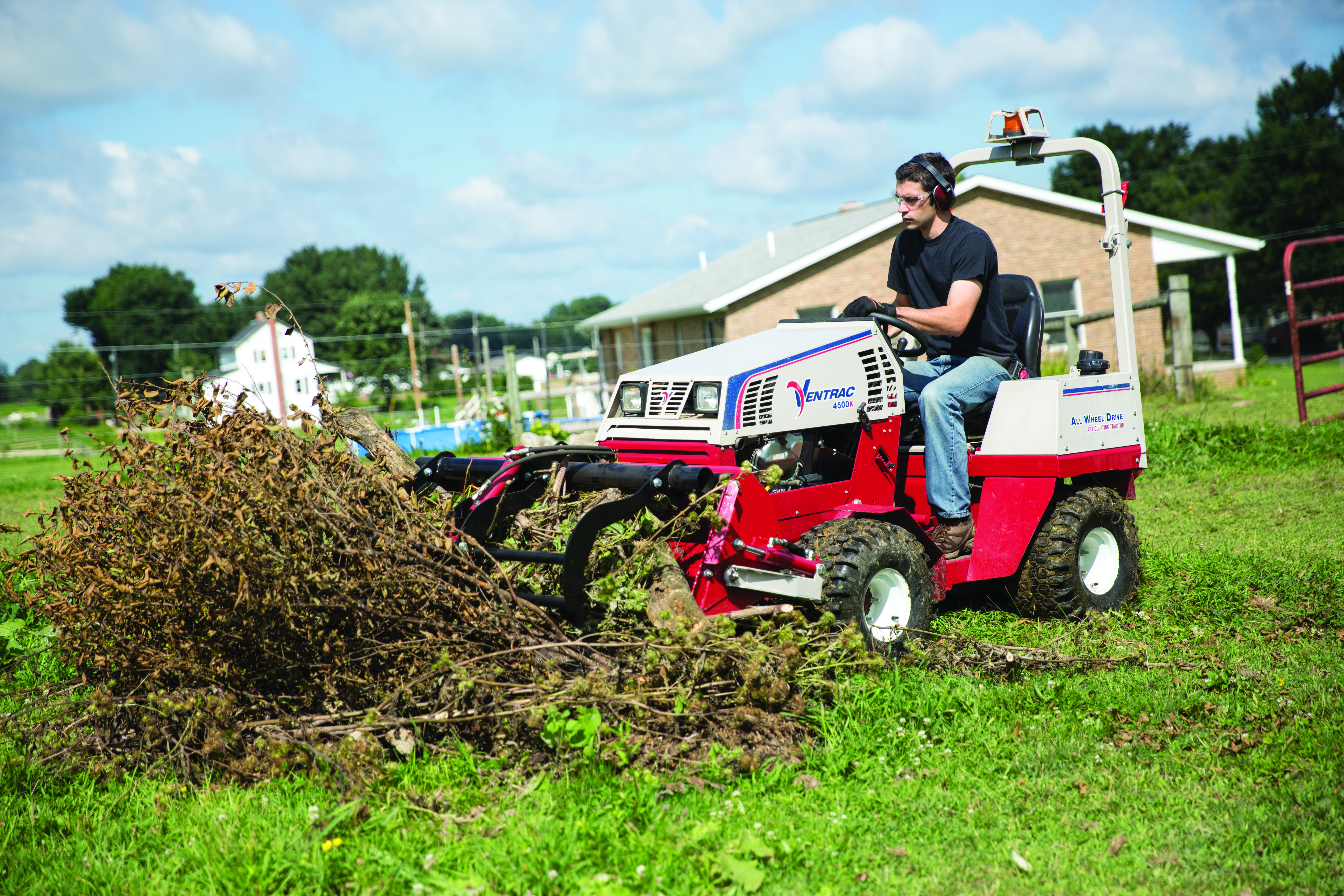 The Ventrac 4500 using the Power Bucket with optional Grapple - Maintaining your yard with the Power Bucket and Grapple on the Ventrac saves time and work moving piles of brush, branches, cuttings, leaves, and such easier than using a wheel barrow.