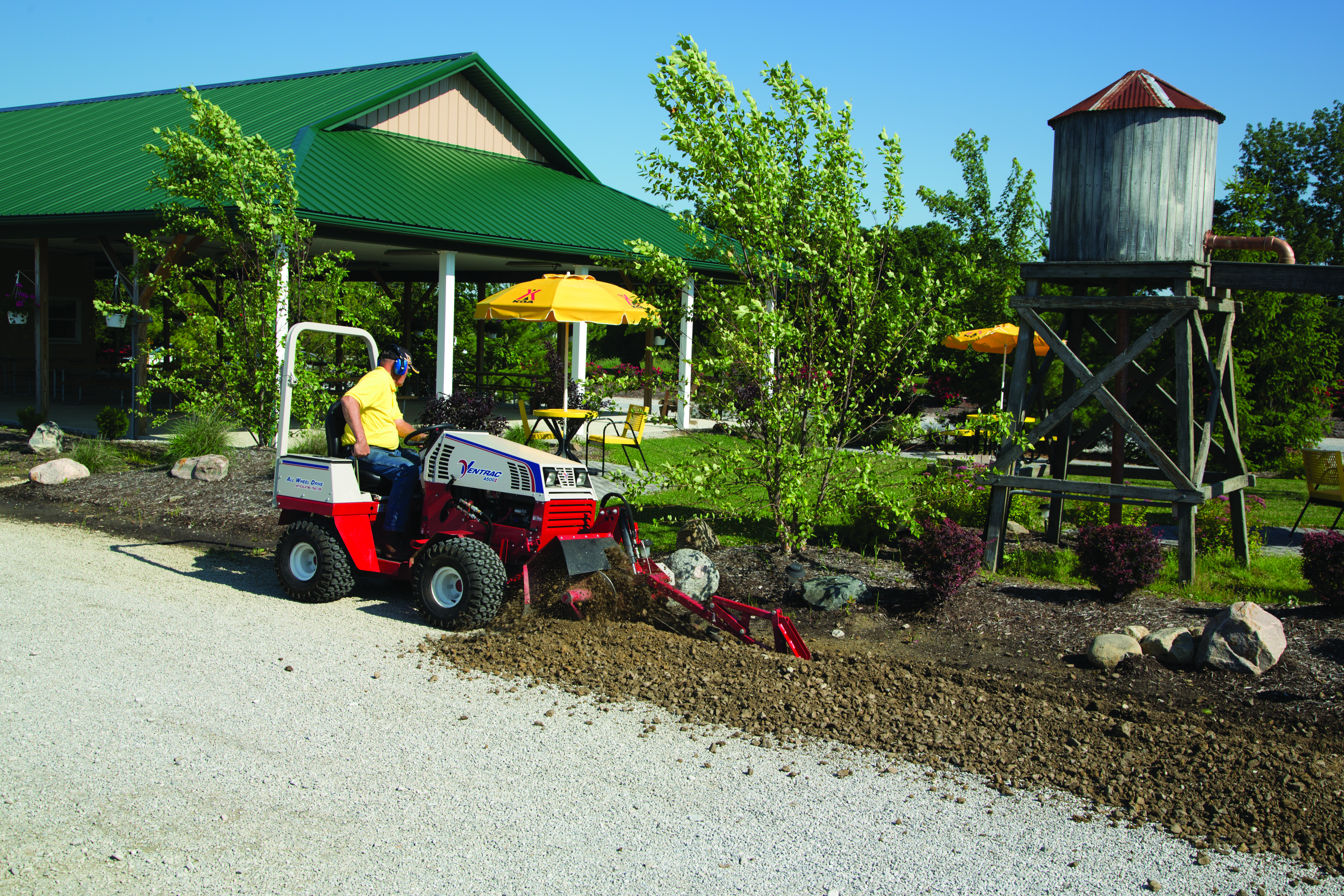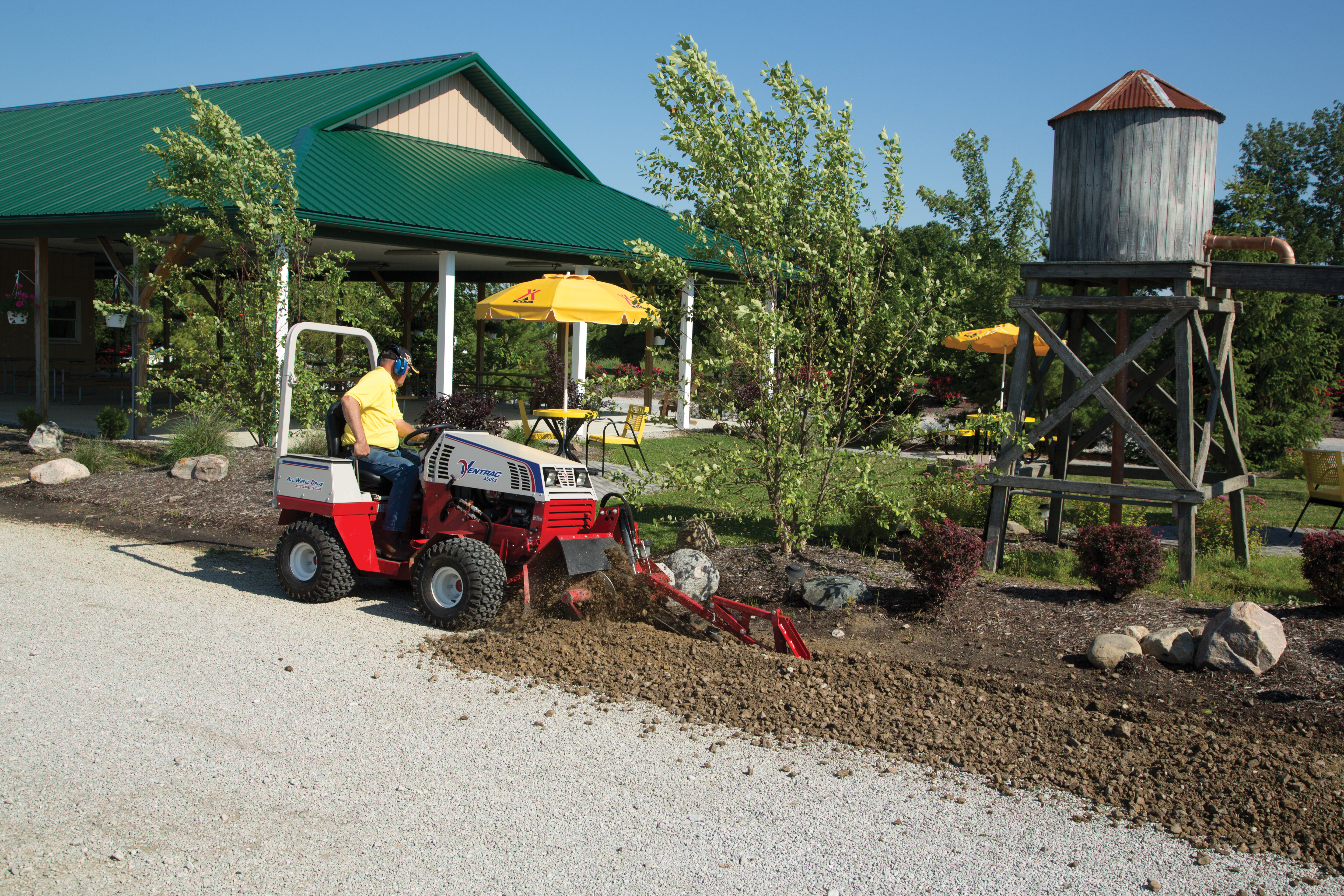 Ventrac 4500 and Trencher - The KY400 attached to a VENTRAC 4000 Series tractor gives the operator the ability to maneuver into hard-to-reach locations without damaging the turf like a traditional track unit would.