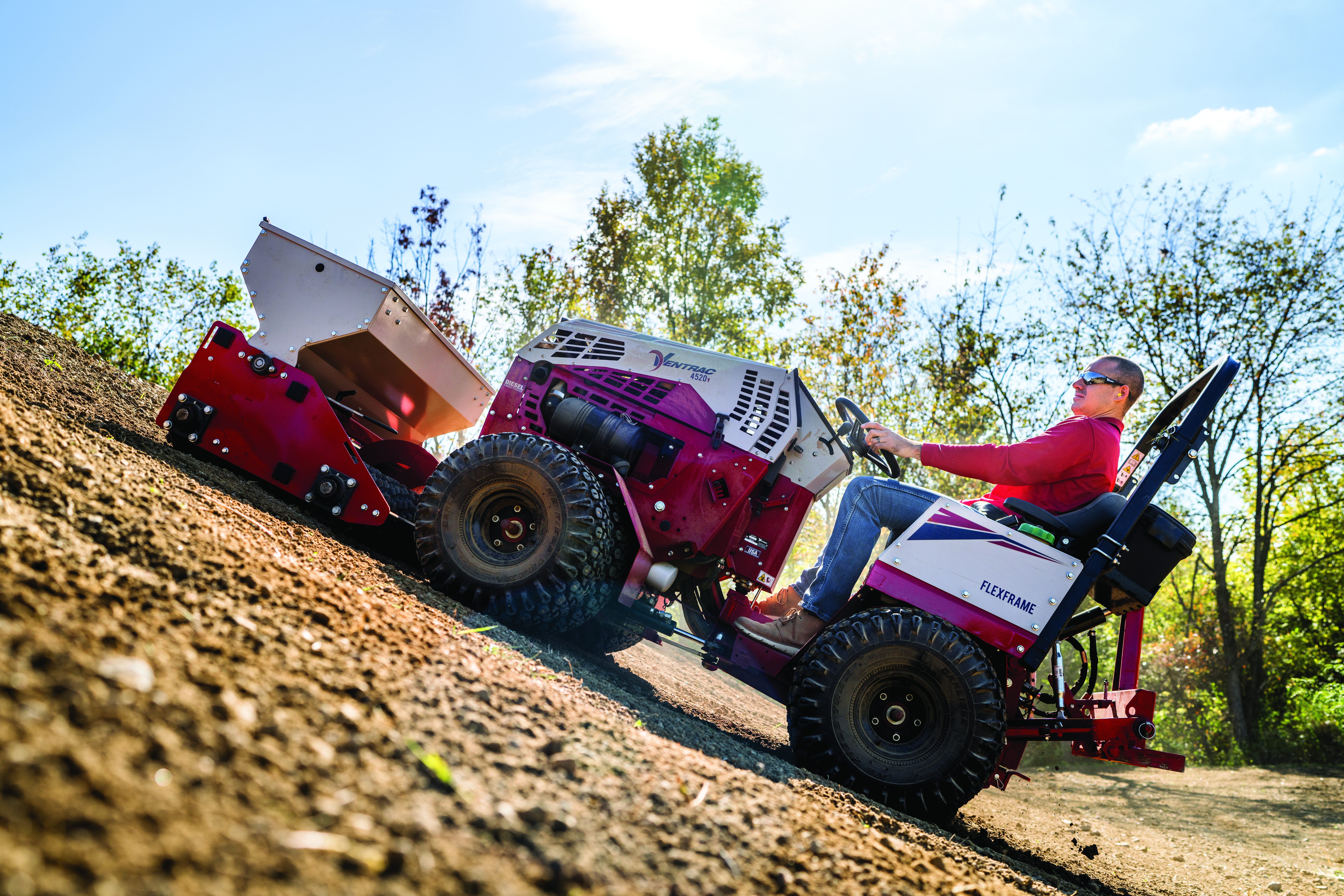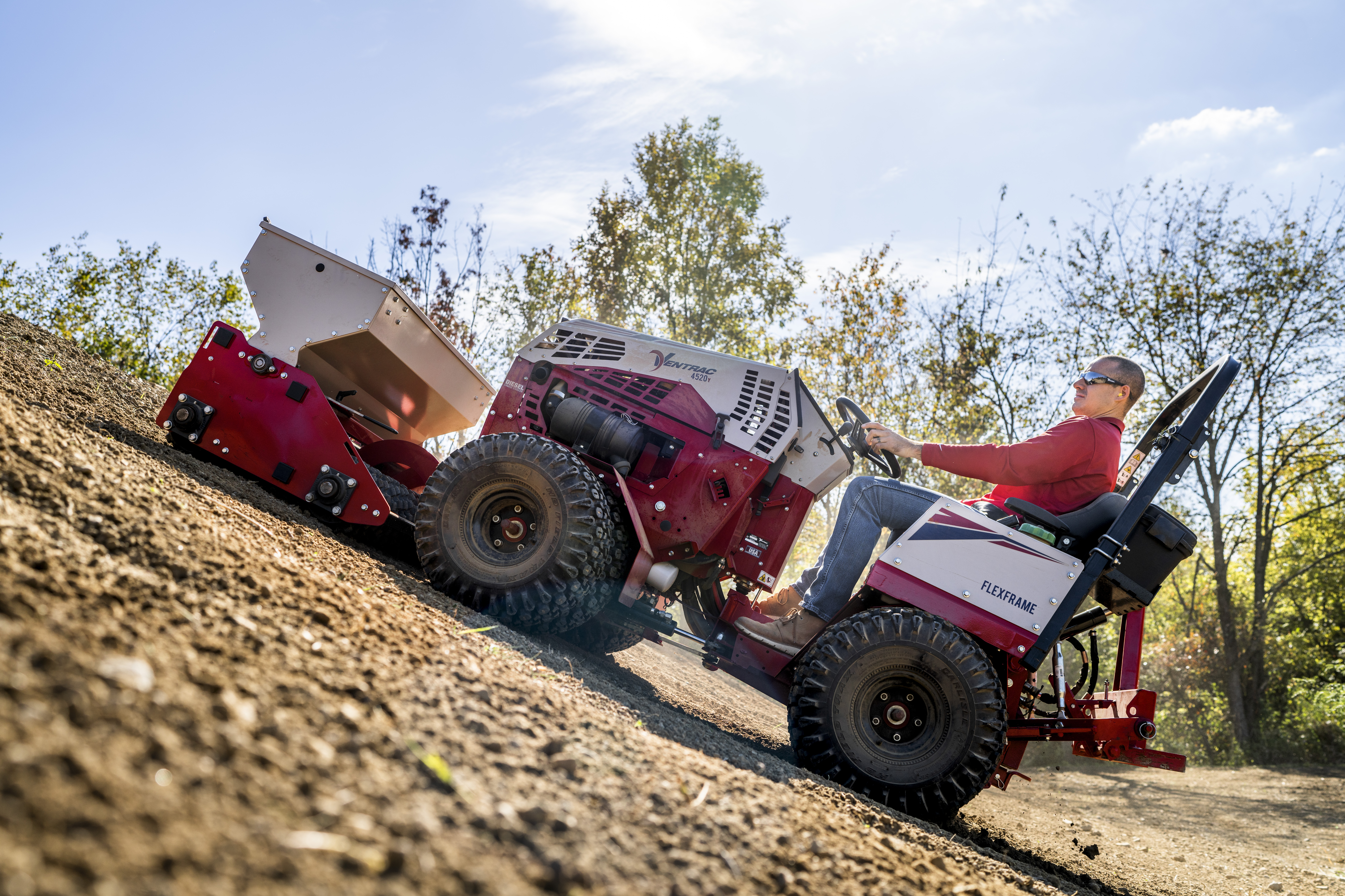 | Description | Ventrac 4520 equipped with the EG520 spreading seed up a hill. Conquer slopes for seeding, mowing, and other tough jobs. |