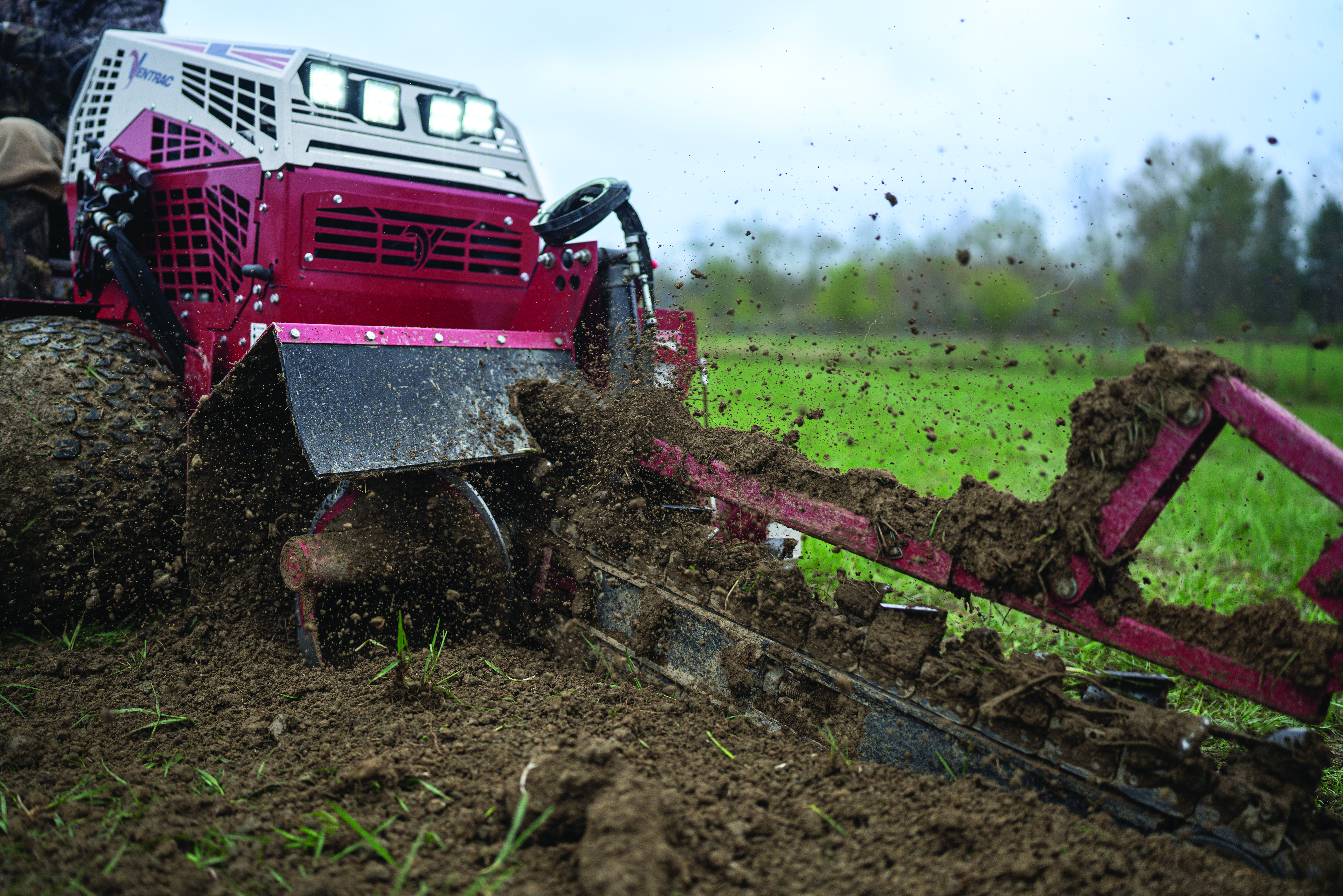 Ventrac Trencher - The Ventrac KY400 Trencher cuts through turf with precision, showcasing its 5½ inch wide cut and ability to reach depths of up to 40 inches. With carbide-tipped cutting chains and dual Push-N-Pull cylinders, it delivers excellent performance in various soil conditions while minimizing turf damage.