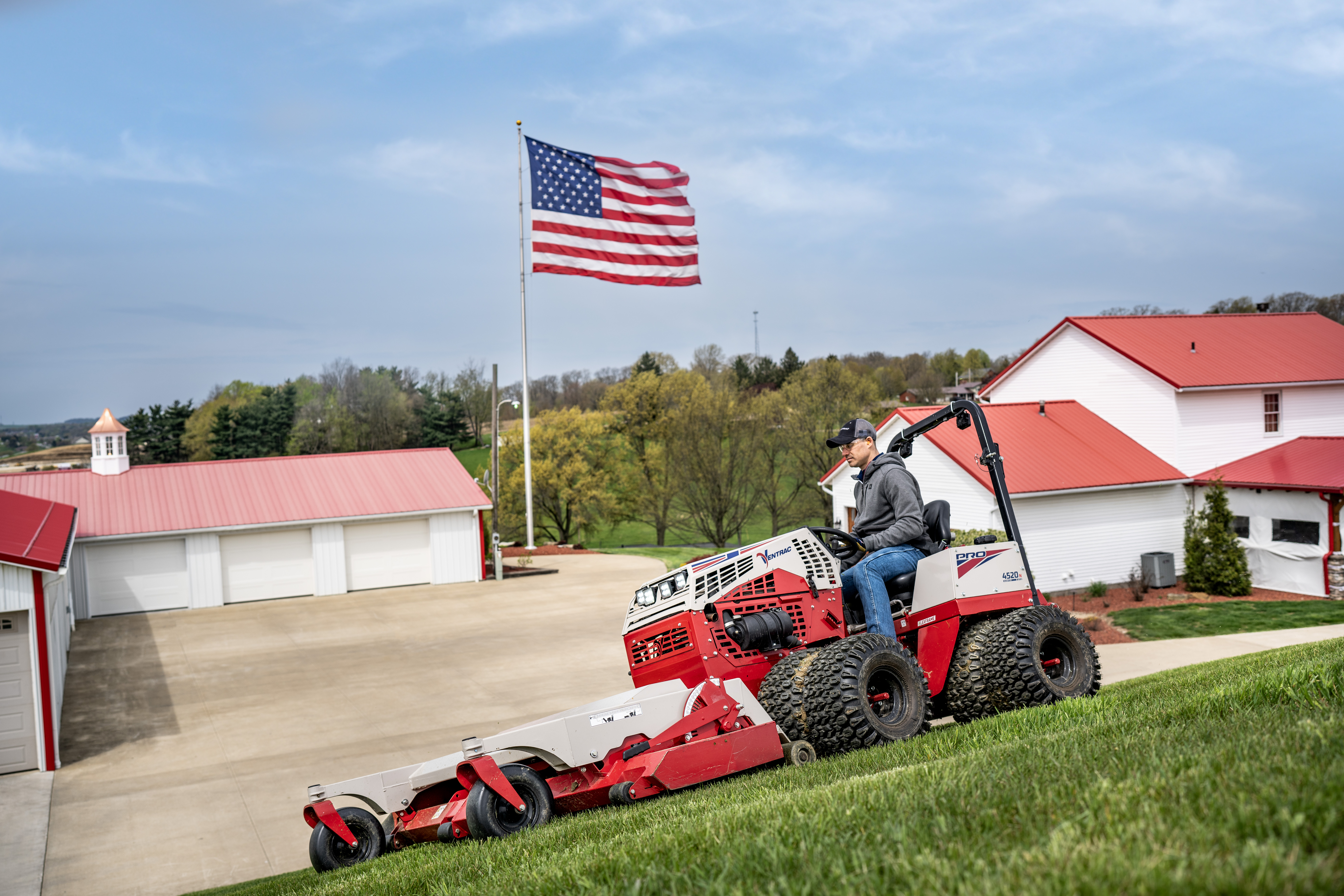 Ventrac Finish Mower - The Ventrac Finish Mower easily mowing across a steep slope, thanks to its superior slope capability. Built for stability and performance, Ventrac handles tough angles while delivering a smooth, even cut.